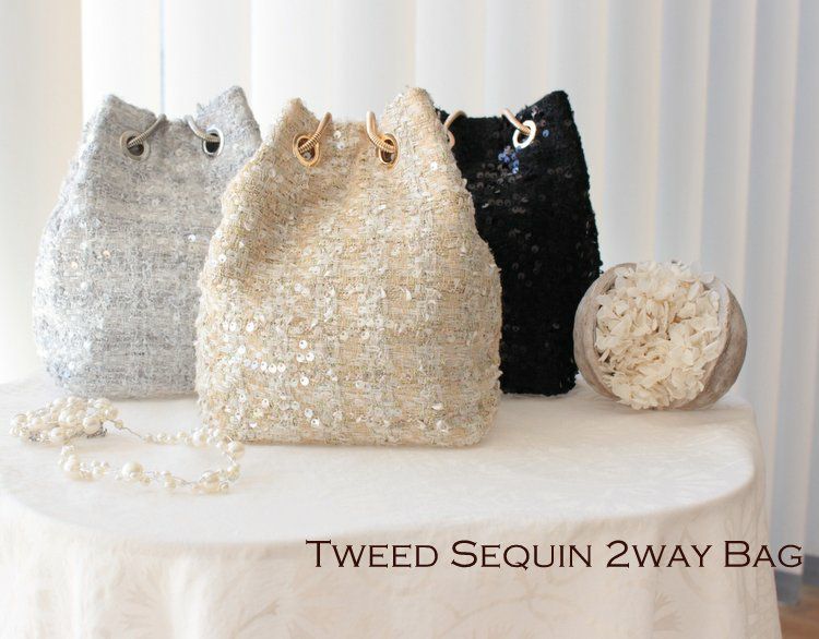 スパンコールとツイード素材が、絶妙な表情を見せるハンドバッグ。コンパクトなフォルムながら、必要なものがしっかり入る収納力。結婚式などのパーティーはもちろん、普段のお出かけなどにも最適。肩掛けスタイルにも対応し、どんなシーンでも活躍する一品です。