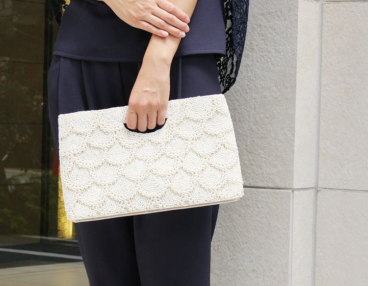 大きさの異なるパールとビーズを贅沢に使用したデザイン。さりげないスケール模様がもおしゃれです。