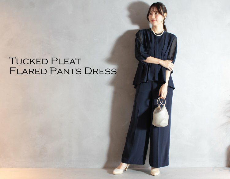 【パーティードレス パンツ】 タックプリーツのフレアパンツドレス(ネイビー)