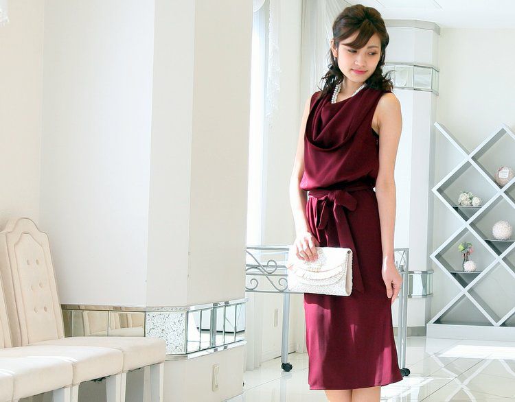 マットなストレッチスムース素材を使用。肌を白く見せてくれる深いワイン色は、きちんと感と大人感を演出。光の当たり具合で微妙に表情を変える立体感も、この素材の魅力の一つです。