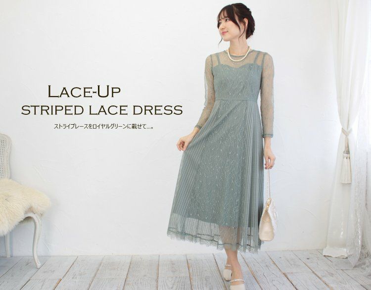 ロイヤルグリーンが優しい印象を与えるレースのドレス。縦ラインを強調するサイドのストライプレースがスタイルアップ効果を実現♪さらに後ろのレースアップ仕様が絶妙なラインを表現します。結婚式の二次会、パーティー、謝恩会、食事会などはもちろん、デイリー使いもできるパーティードレスです。