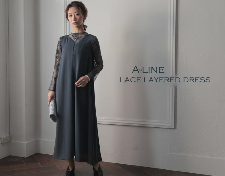 【パーティードレス】 Aラインレースレイヤードドレス(ダークブルーグレー)