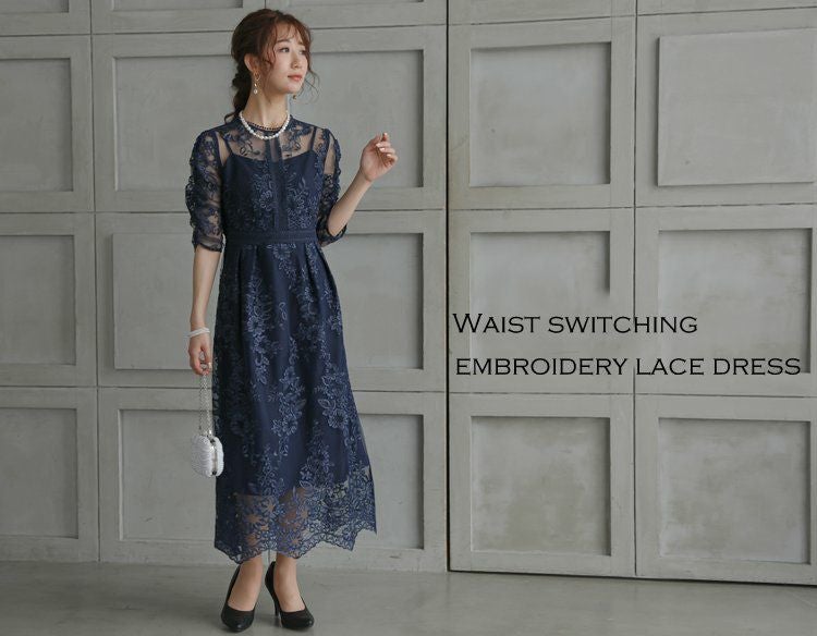 【パーティードレス】 ウエスト切替刺繍レースドレス(ネイビー)