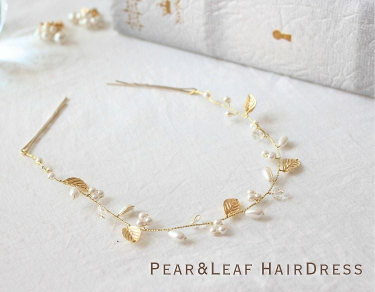 ゴールドのリーフとパール&ビーズが髪を華やかに。