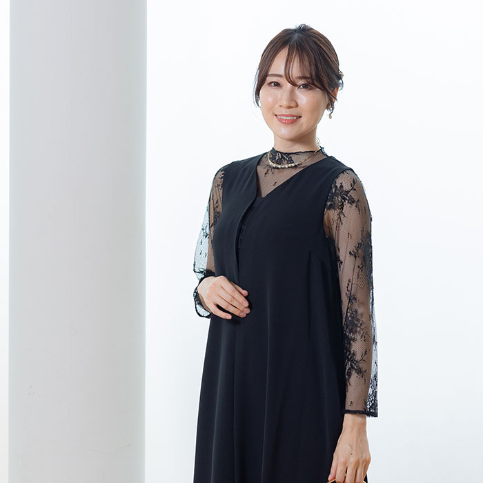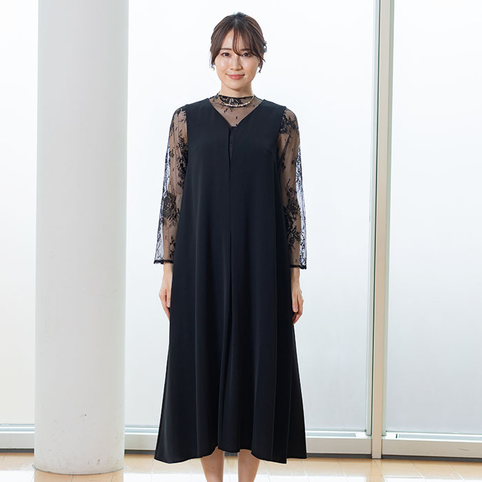 シンプルなAラインが素敵なレイヤード風ドレス。 気になる二の腕やデコルテ部分を上品なレースがしっかりカバー。 ふんわりシルエットだけでなく、細ベルト(別売)とのコーデもおしゃれに決まります♪